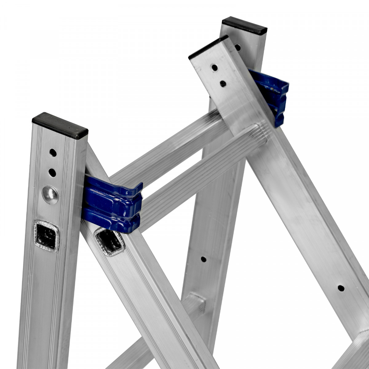 - Надежная конструкция — ступеньки прочно соединены с опорами за счет многократной развальцовки, выдвижная секция крепко удерживается алюминиевыми кронштейнами.