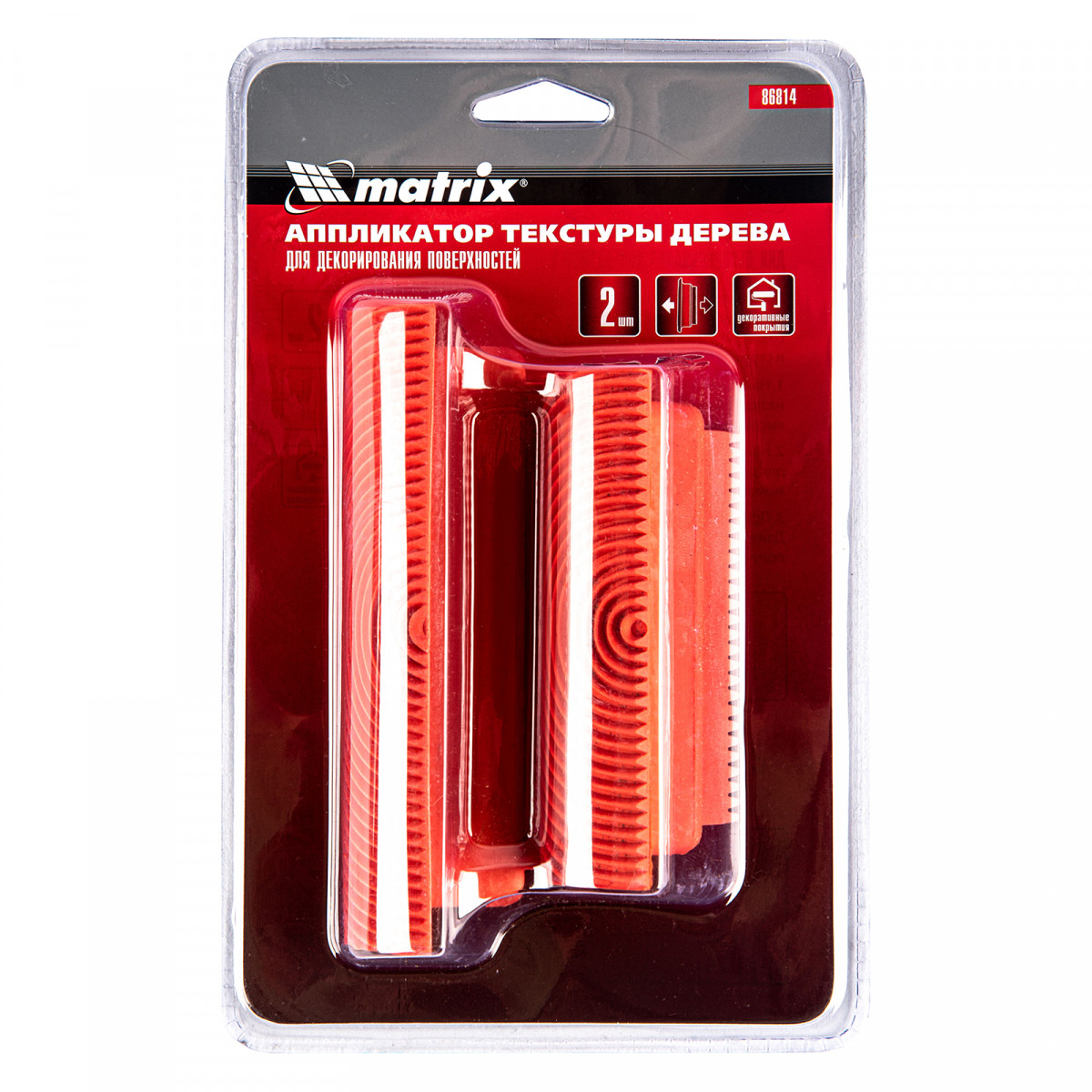 Аппликатор текстуры дерева Matrix 86814, 2 предм., используется на поверхностях из металла, пластика и других. Применяется для нанесения декоративных узоров — создает рисунок фактуры древесины. Обратную сторону аппликатора можно использовать для создания линейных узоров на декоративной краске и структурной штукатурке.