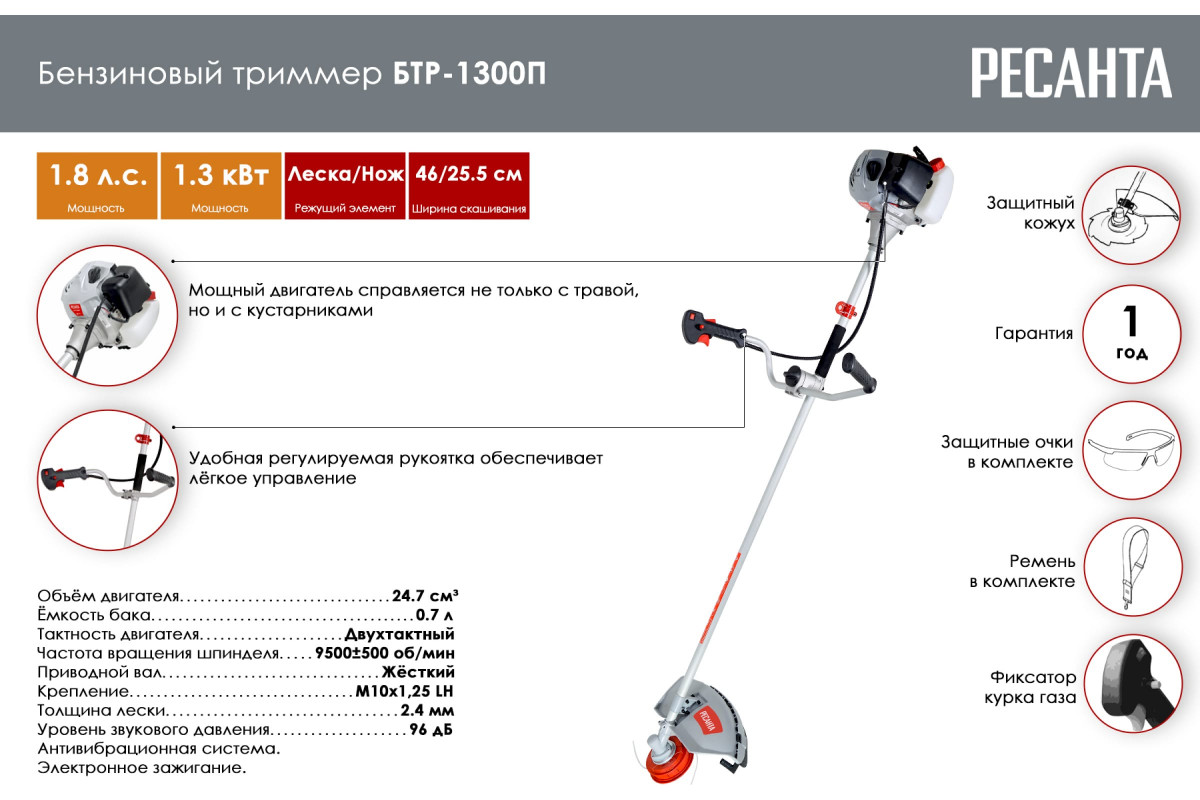 Бензиновый триммер Ресанта БТР-1300П 70/2/35 предназначен для использования на приусадебных и прочих участках.