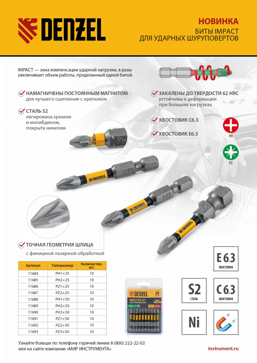 Бита IMPACT, PZ1x25 мм, лазерная обработка шлица, сталь S2, 10 шт., Е 6,3 Denzel