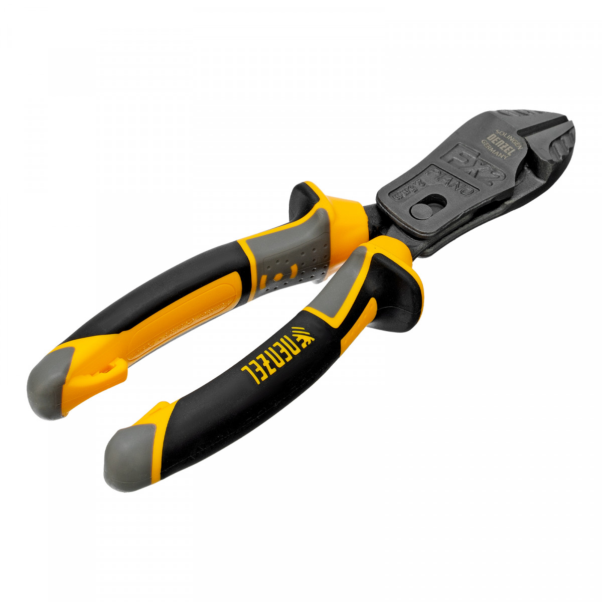 Усиленные бокорезы Denzel 17785 длиной 180 мм, с трехкомпонентными рукоятками, предназначены для разрезания кабелей, проводов, гвоздей и проволоки средней (750 Н/мм2) и высокой жесткости (1800 Н/мм2) диаметром 4 и 2,8 мм соответственно. Подходят для резки рояльных струн (предел прочности 2300 Н/мм2) диаметром до 2,5 мм. Успешно справляются не только с медными, алюминиевыми и пластмассовыми деталями, но и с более жесткими стальными элементами. Встроенный рычажный механизм и смещенный непосредственно к режущим кромкам шарнир увеличивают усилие реза на 50%.