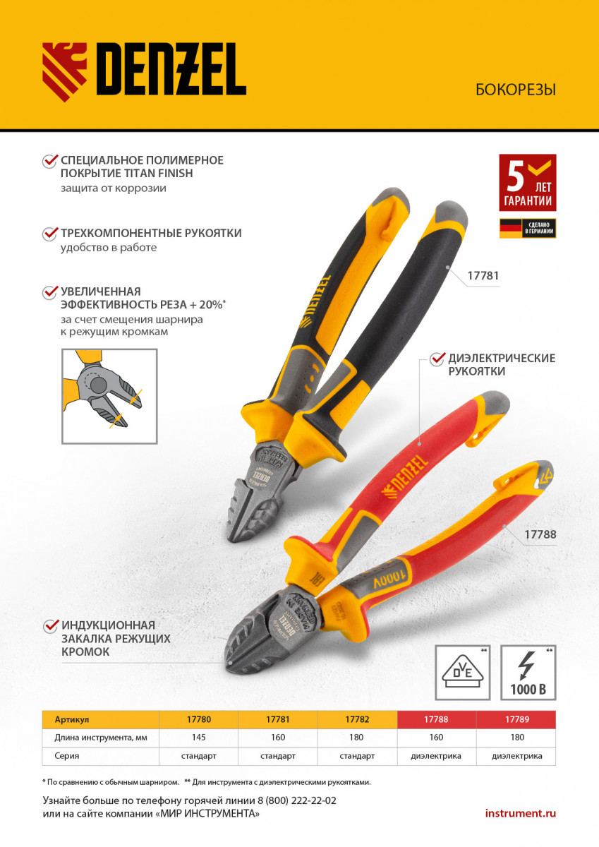 Бокорезы Denzel 17788 длиной 160 мм, с трехкомпонентными диэлектрическими рукоятками, рассчитанными на напряжение до 1000 В, предназначены для разрезания кабелей, проводов, проволоки, стержней из пластмассы и металла. Максимальный диаметр перерезаемой мягкой проволоки (алюминиевой, медной, с пределом прочности 220 Н/мм2) составляет 6 мм, проволоки средней жесткости и гвоздей (750 Н/мм2) — 3,5 мм, жесткой (1800 Н/мм2) — 2 мм. Бокорезы подходят для проведения электромонтажных работ. Инструмент эффективно справляется с поставленными задачами благодаря шарниру, смещенному к режущим кромкам и увеличивающему усилие реза на 20%.