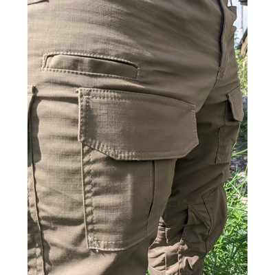 12 функциональных карманов, в том числе карманы для удобного использования в положении сидя. Зона колена усилена, предусмотрен отсек для наколенников. Тефлоновое покрытие упрощает уход за изделием.