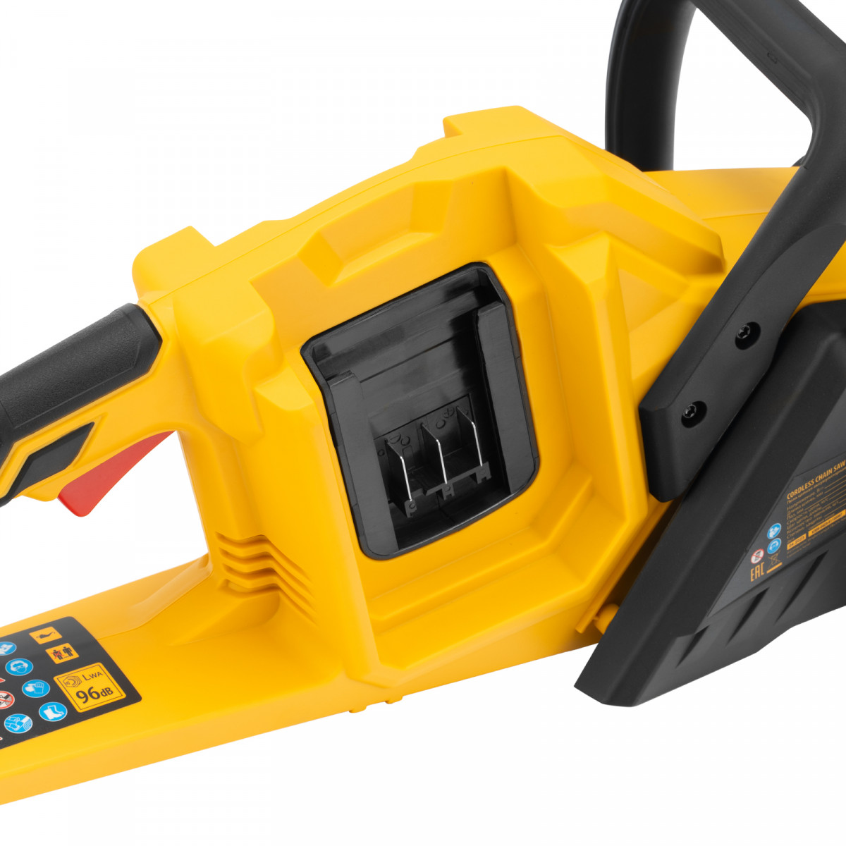 Пила работает на единой платформе Denzel battery system и совместима с аккумуляторами 18 В. Модель поставляется с прочной и легкой шиной OREGON длиной 40 см и цепью с шагом 3/8".