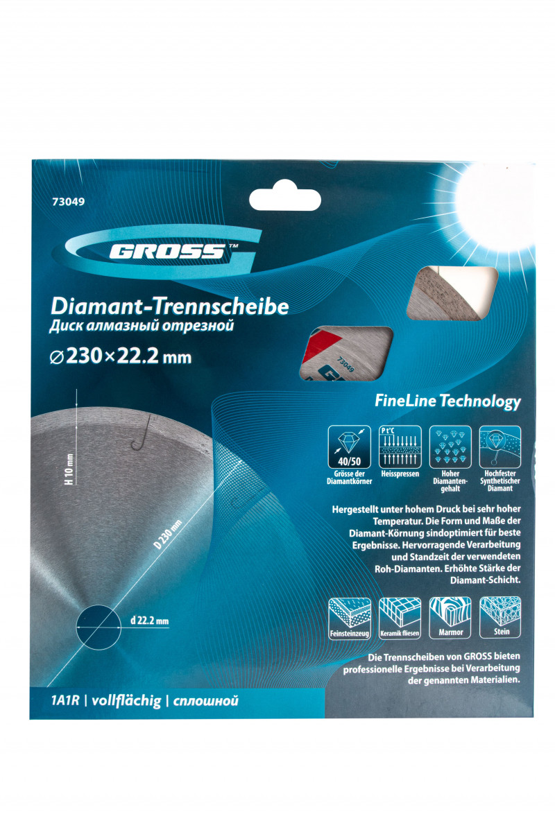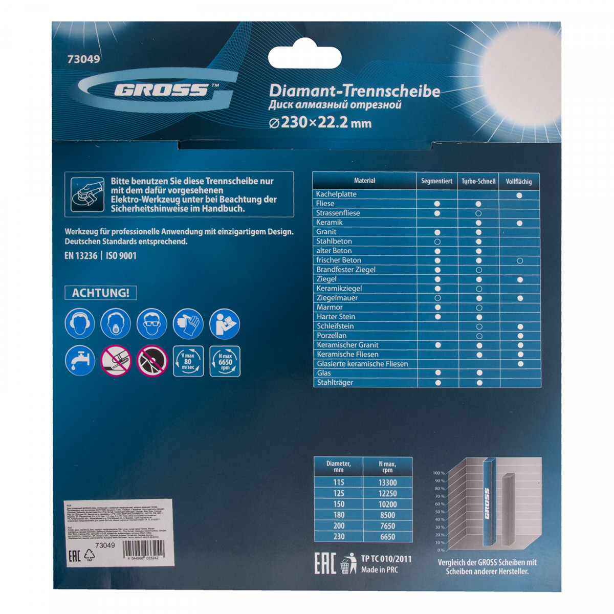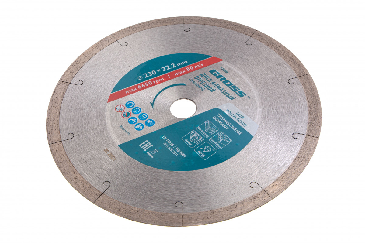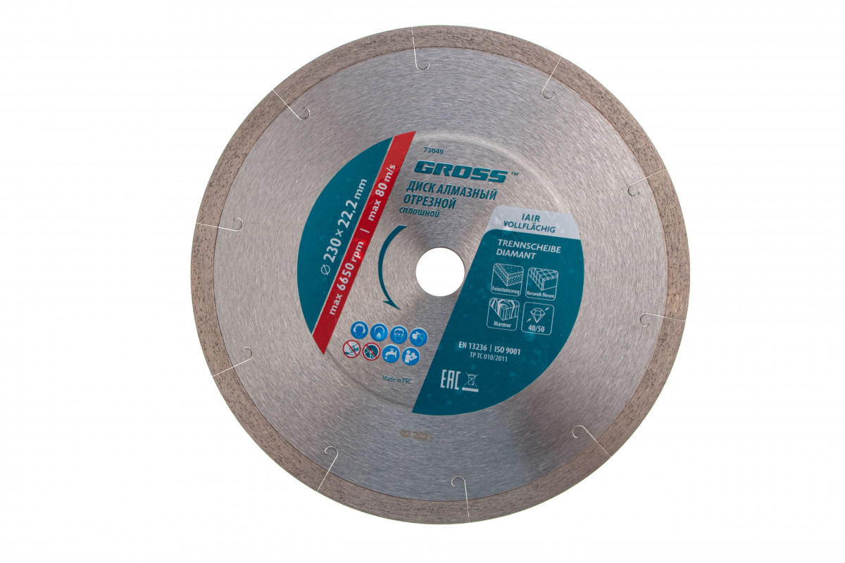 Диск алмазный, 230 х 22.2 мм, сплошной c лазерной перфорацией, мокрая резка Gross