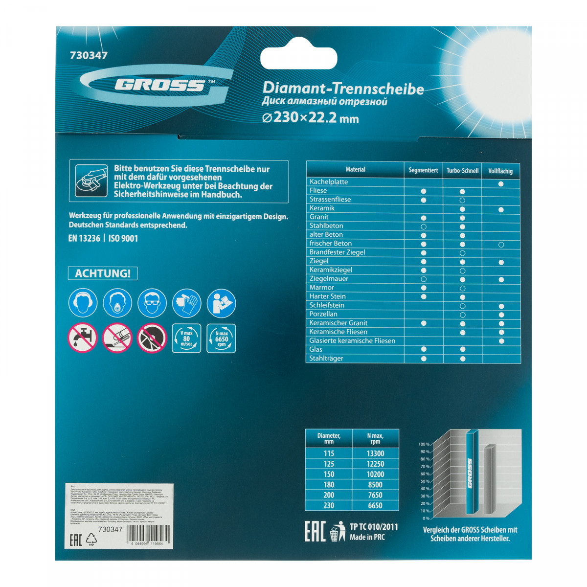 Алмазный диск Gross 730347 диаметром 230 х 22,2 мм, с рабочей частью «турбо», применяется для сухой резки твердых материалов: бетона, в том числе свежего, среднеармированного железобетона, кирпича, гранита, камня и песчаника. Работа с разными типами материалов возможна благодаря оптимально подобранной металлической связке. Инструмент используется в качестве расходника на профессиональных УШМ.
