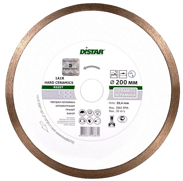 Алмазный инструмет серии HARD CERAMICS это сплошной круг, который режет только влажным способом. Его используют на станках и плиткорезах, но модели с небольшим диаметром могут использоваться и на ручных УШМ, с настроенным охлаждением.