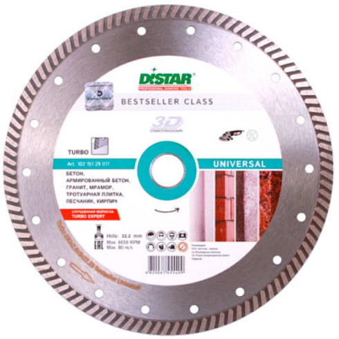 Диск отрезной алмазный относится к серии Turbo Bestseller Universal и представляет собой высококачественный профессиональный инструмент, предназначенный для резки бетона, армированного бетона, всех видов гранита и песчаника, тротуарной плитки. Диск одинаково стабильно может справляться как с резкой бетона, так и гранита. Он имеет высокий ресурс и уверенно поддерживает скорость резки. Для работы на УШМ.