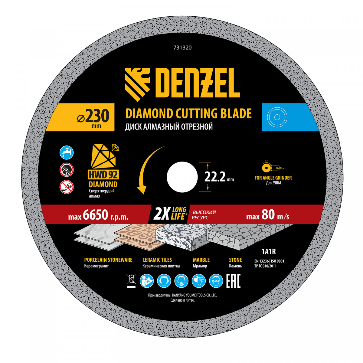 Диск алмазный отрезной DENZEL, ф230 х 22.2 мм, сплошной, мокрый рез, HWD92, круг, 731320