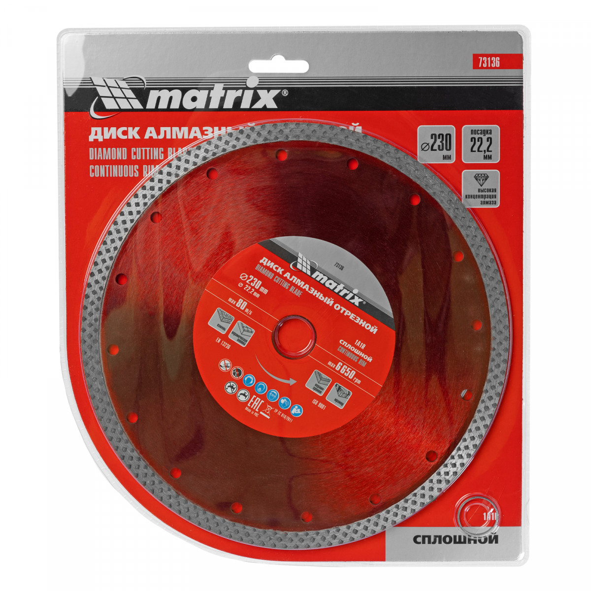 Сплошной отрезной алмазный диск Matrix 73136 диаметром 230 мм — оснастка для болгарок и плиткорезов с диаметром вала 22,2 мм. Применяется для сухого и мокрого резания мрамора, искусственного и натурального камня, керамогранитной и керамической плитки. Использование без подачи воды расширяет возможности инструмента, но для увеличения ресурса диска рекомендуется применять водяное охлаждение. Оснастка предназначена для решения бытовых задач.