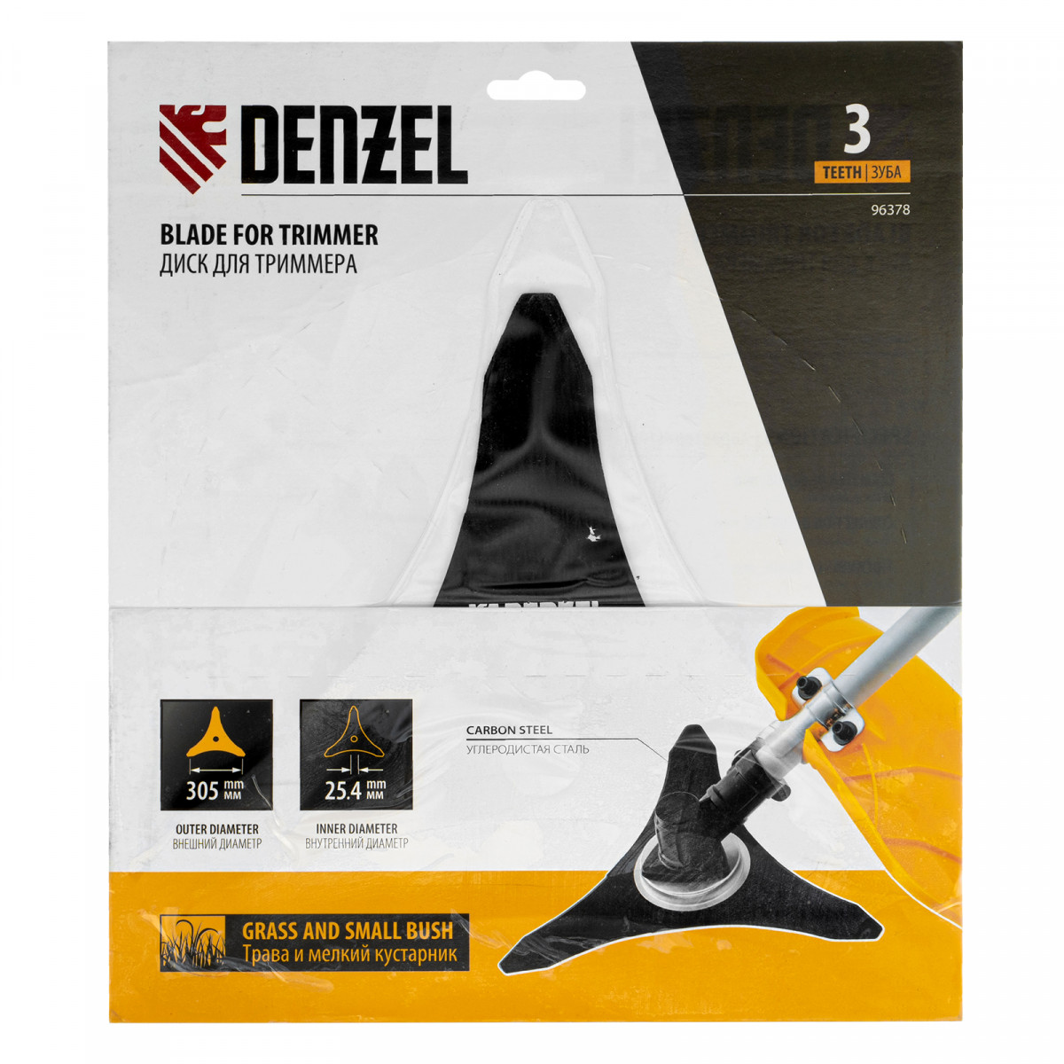 Диск для триммера Denzel 96378 с 3 лезвиями, толщиной 1,6 мм, с внешним диаметром 305 мм и посадочным — 25,4 мм, используется для скашивания травы и мелкого кустарника. Устанавливается на бензокосу или электротриммер с верхним расположением двигателя и прямой штангой. Позволяет быстро очистить от сорняков и крупностеблевой растительности территорию большой площади. Диск пригодится владельцам загородных участков.