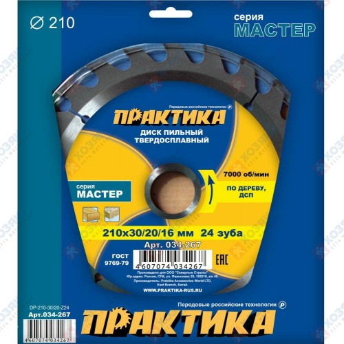 Диск пильный 210*30/20/16 мм 24 зуба по дереву, ДСП "Практика"