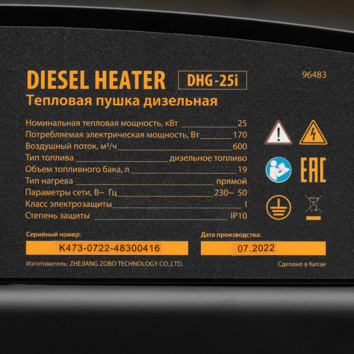 Дизельная тепловая пушка DHG-25i, 25 кВт, 600 м3/ч, прямой нагрев, термостат Denzel
