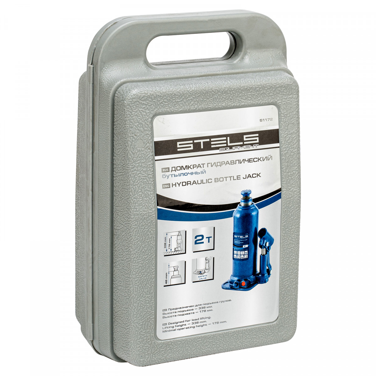 Гидравлический бутылочный домкрат Stels 51172 в пластиковом кейсе предназначен для поднятия грузов весом до 2 т на высоту 178-338 мм. Он не занимает много места и легко помещается в багажник, поэтому его можно брать с собой в дорогу или хранить в гараже. Используется для самостоятельного ремонта авто, также подходит для профессионального применения на станциях технического обслуживания.