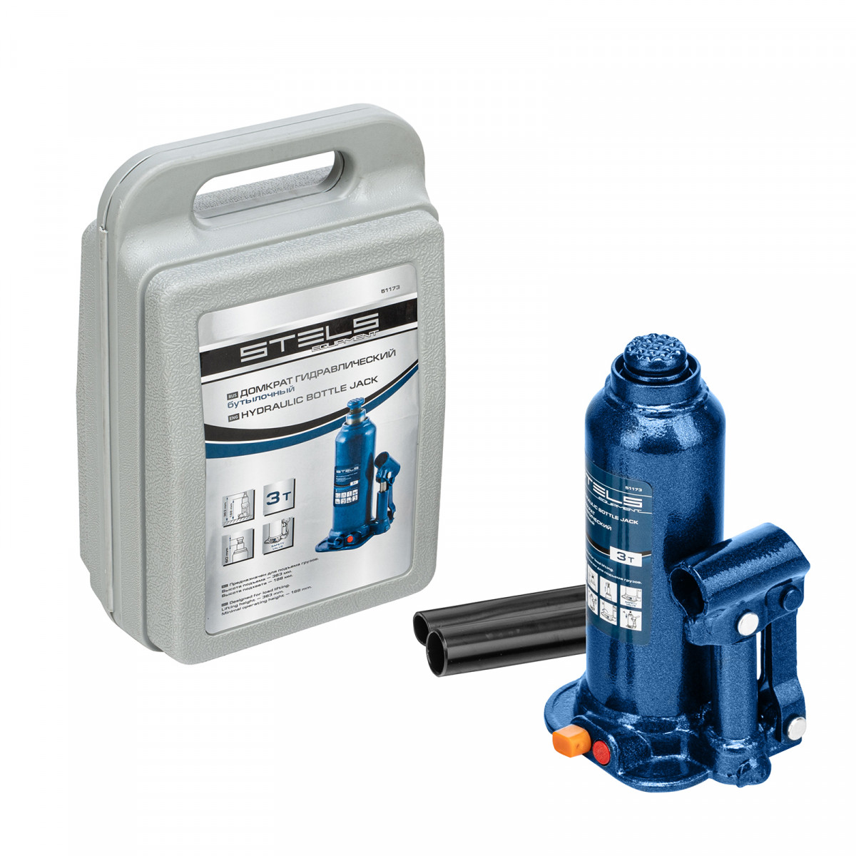 Гидравлический бутылочный домкрат Stels 51173 в пластиковом кейсе предназначен для поднятия грузов весом до 3 т на высоту 188-363 мм. Он не занимает много места и легко помещается в багажник, поэтому его можно брать с собой в дорогу или хранить в гараже. Используется для самостоятельного ремонта авто, также подходит для профессионального применения на станциях технического обслуживания.