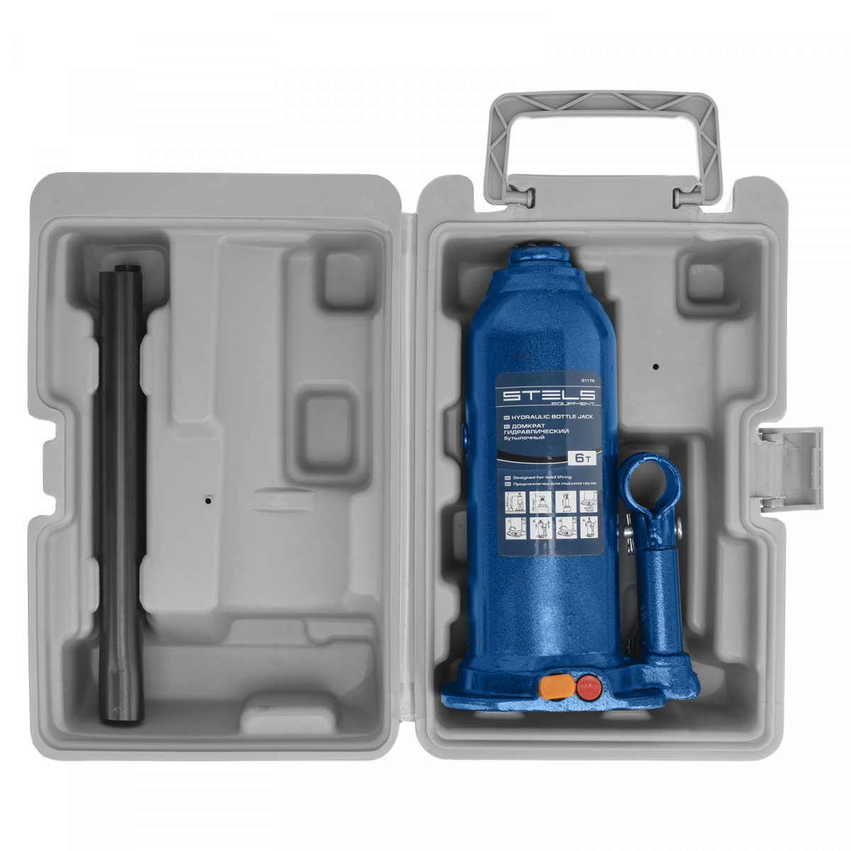 Гидравлический бутылочный домкрат Stels 51176 в пластиковом кейсе предназначен для поднятия грузов весом до 6 т на высоту 207-404 мм. Он не занимает много места и легко помещается в багажник, поэтому его можно брать с собой в дорогу или хранить в гараже. Используется для самостоятельного ремонта авто, также подходит для профессионального применения на станциях технического обслуживания.