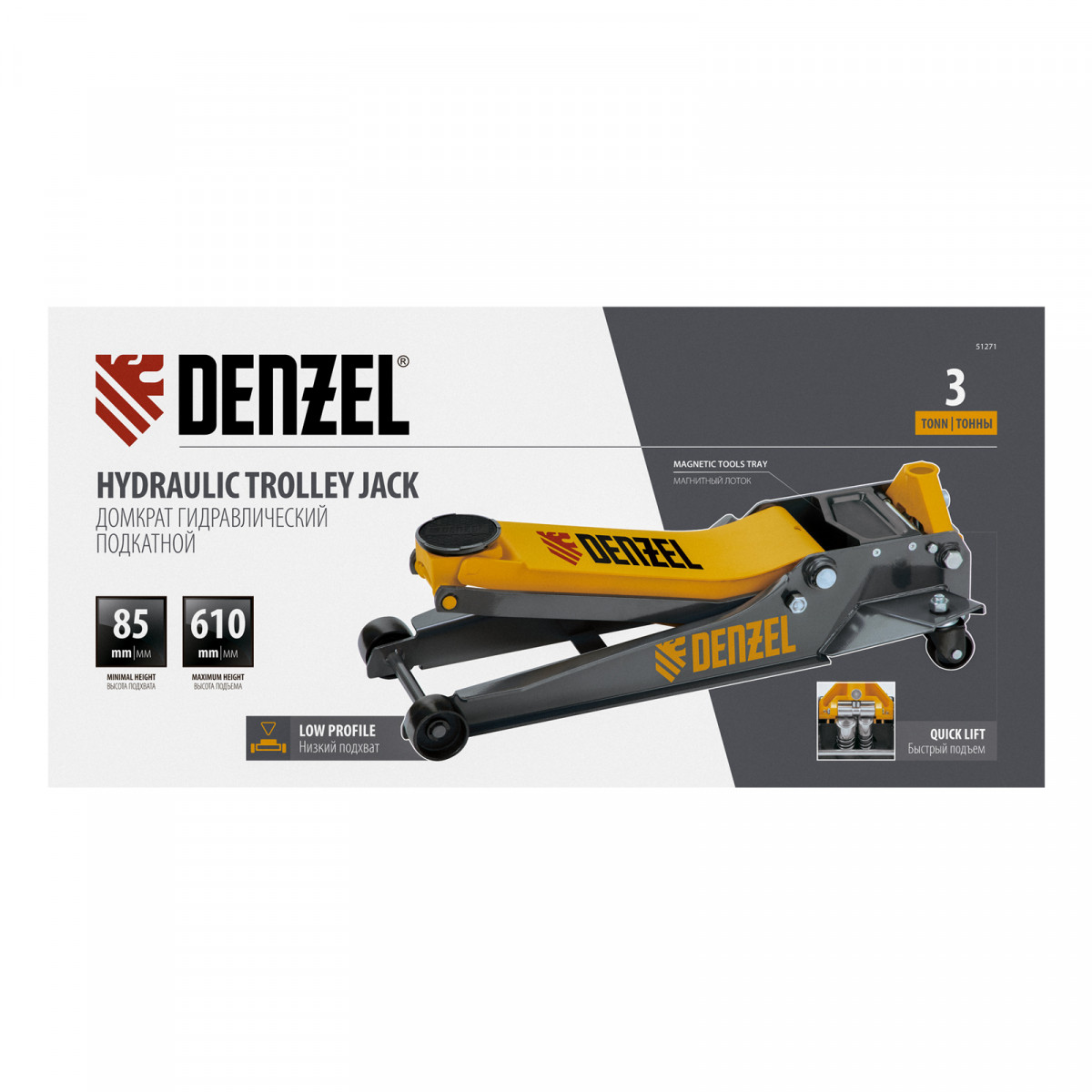 Профессиональный подкатной гидравлический домкрат Denzel 51271 с низким подхватом используется для быстрого подъема на высоту 85-610 мм всех типов автомобилей с любым клиренсом и массой до 3 т, в том числе SUV. В гидравлическом блоке предусмотрено 2 насоса (система быстрого подъема QUICK LIFT), благодаря чему для достижения предельной высоты достаточно 6 качков рукоятки. Домкрат подходит для использования на станциях техобслуживания и шиномонтажа.