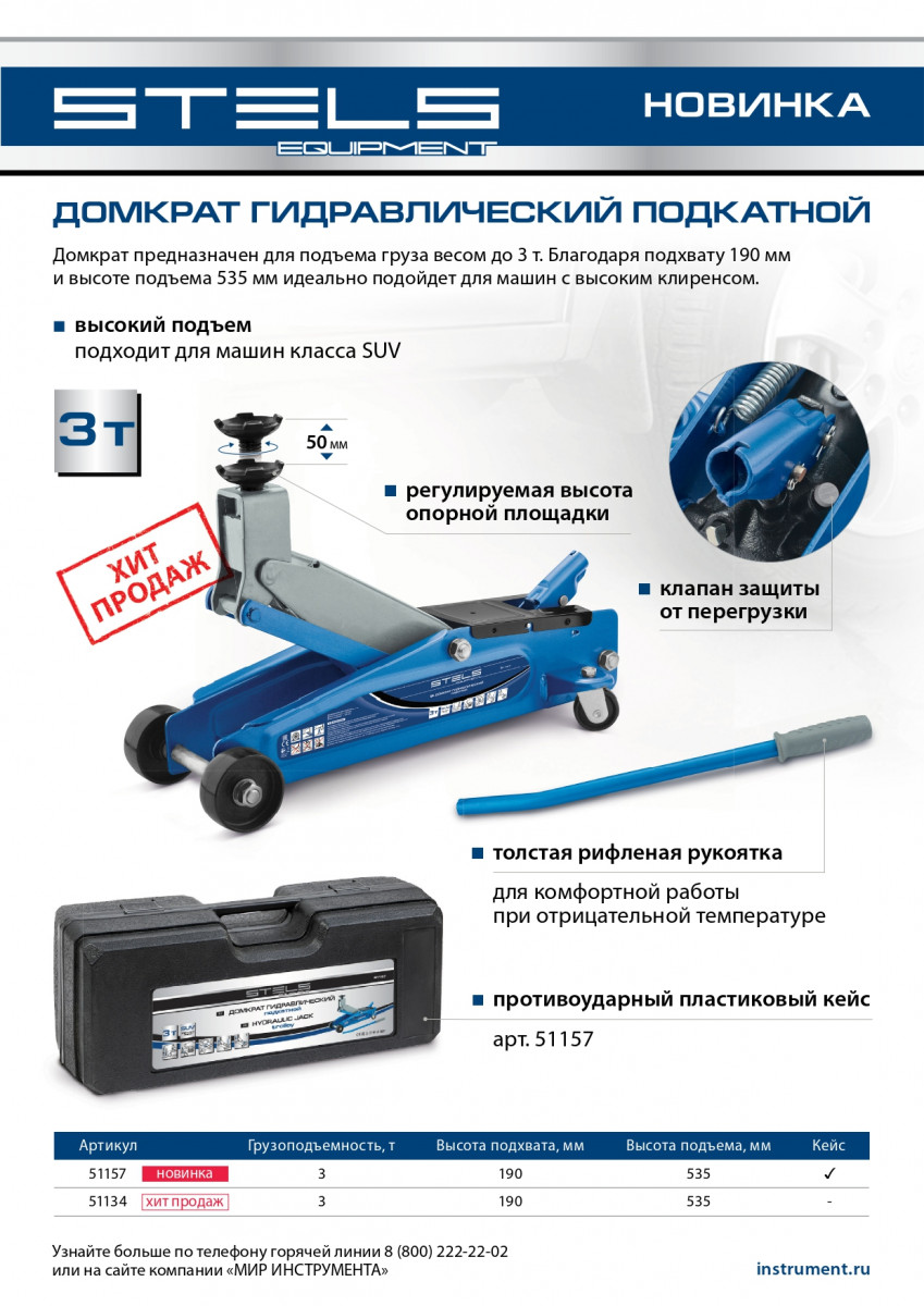 Домкрат гидравлический подкатной, высокий подъем, 3т, SUV, 190-535 мм Stels