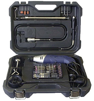 Кейс, отдельная коробочка для насадок, гибкий вал, довольно много насадок, фонарик. Качество насадок на мой непрофессиональный взгляд достаточно хорошее. При работе сам гравер и гибкий вал почти не греются, работал достаточно долго.