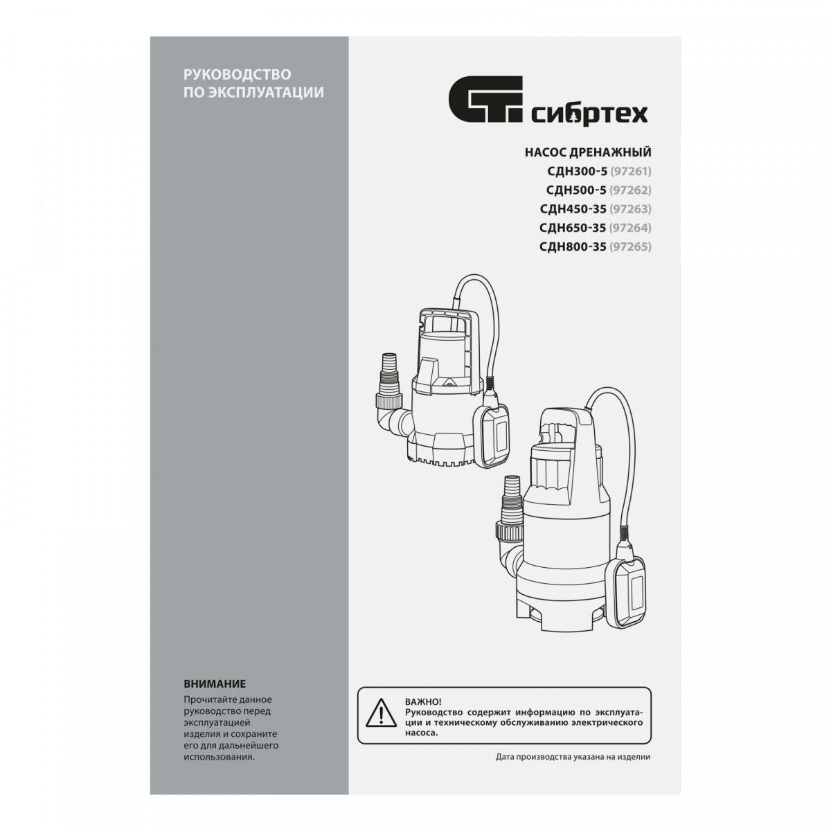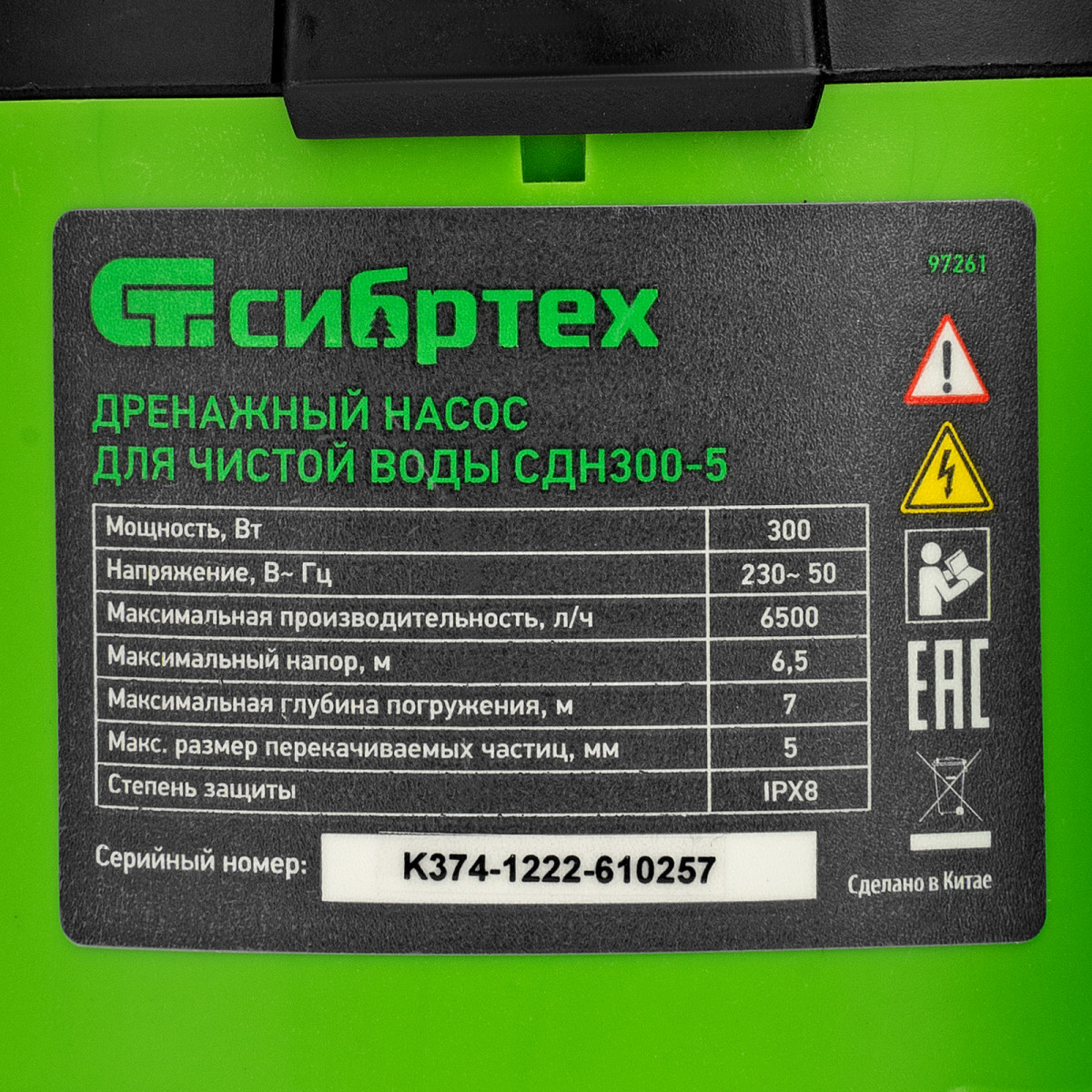 Дренажный насос для чистой воды СДН300-5, 300 Вт, напор 6.5м, 6500 л/ч Сибртех
