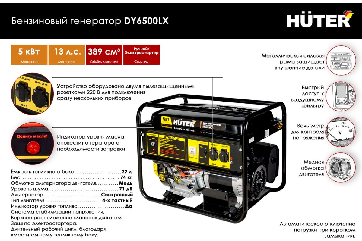 Электрогенератор Huter DY6500LX-электростартер - устройство для питания электрооборудования вдали от населенных пунктов, на стройплощадке или в случаях отключения электричества. Вырабатывает до 5 кВт электроэнергии. Оснащен мощным четырехтактным двигателем с верхним расположением клапанов. Агрегат оборудован датчиками уровня топлива и масла для своевременной дозаправки. Специальные резиновые стойки уменьшают вибрацию электрогенератора при работе.