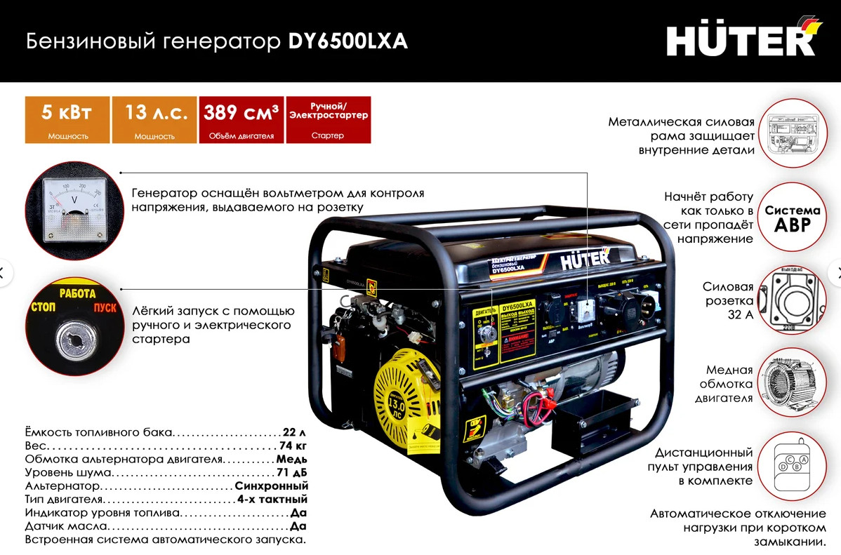 Электрогенератор Huter DY6500LXA прост и удобен в применении, встроенная система автоматического запуска заводит генератор, когда пропадает напряжение во внешней сети и глушит, когда напряжение появляется вновь. Дистанционный пульт управления позволяет заводить и глушить  генератор на расстоянии до 15 метров. Станция оснащена защитой от короткого замыкания и перегрузок и индикаторами уровня топлива и масла для своевременной дозаправки. Данная модель может работать как на газу, так и на бензине. Принудительное воздушное охлаждение двигателя предотвращает его поломку вследствие перегрева. Его широко используют для питания электрооборудования на даче, отдыхе или в быту при отключении электросети.