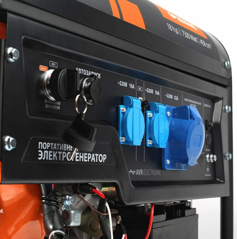 • Силовая розетка 32 А для снятия всей мощности генератора (силовая вилка 32 А в комплекте);