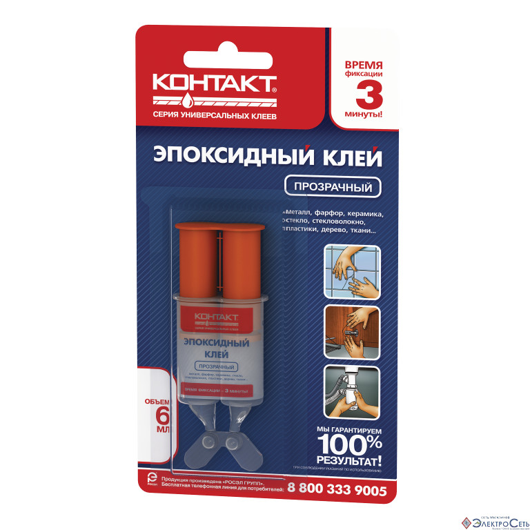 Эпоксидный клей Контакт прозрачный, 6 мл 12051 выполнен на основе полиэпоксидной смолы и отвердителя. Двухкомпонентное средство предназначено для склеивания металлов и их сплавов, стекла, дерева, фарфора и т.д. Создаваемый клеем шов обладает стойкостью к воздействию масел, бензина и воды, он не дает усадку и не расширяется.
