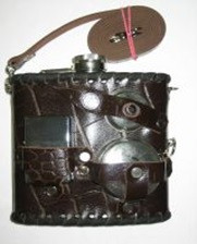 Фляжка(500мл) из нержавеющей стали, обшитая тисненой натуральной кожей под кожу крокодила или рептилии, коричневого цвета, со съемным ремешком