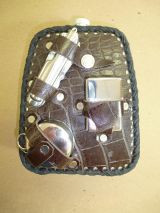Фляжка из нерж. стали, обшитая натуральной кожей, с худ. оформлением. В комплект входит: зажигалка, стакан складной, нож складной многофункциональны
