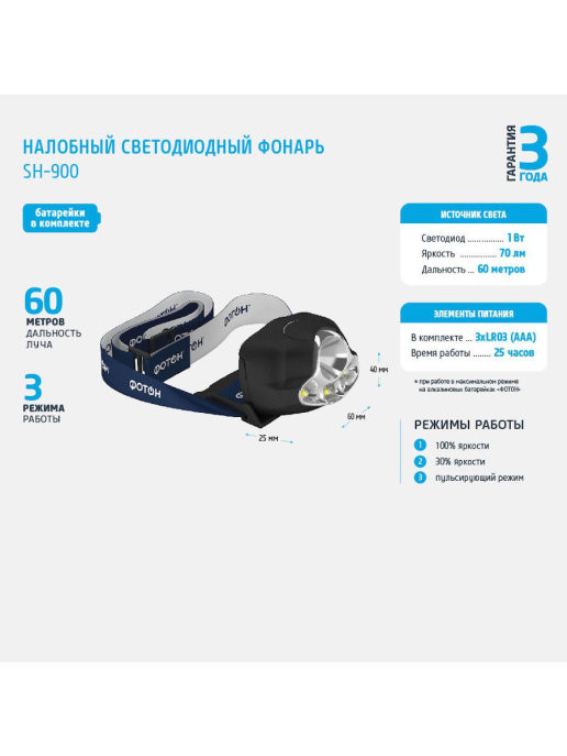 Ассортимент налобных фонарей ФОТОН позволяет выбрать модель подходящий под конкретный запрос покупателя: по яркости, дальности луча, времени работы на одного комплекте батареек, весу и внешнему виду. Батарейки 3xLR03 в комплекте. Источники света - 1 мощный светодиод 1W, 3 вспомогательных диода. Прекрасно подходит для выполнения ремонтно-сборочных работ в гараже или мастерской, а также туристических походов.