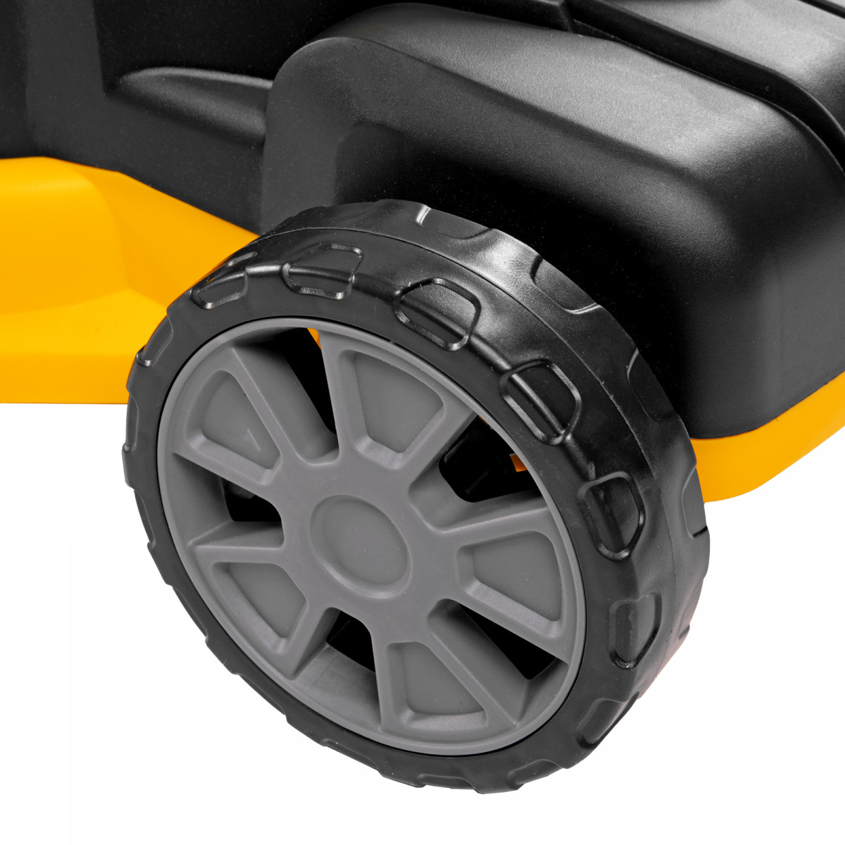 • Маневренность — широкие колеса позволяют удобно перемещать газонокосилку по участку и не приминают траву.