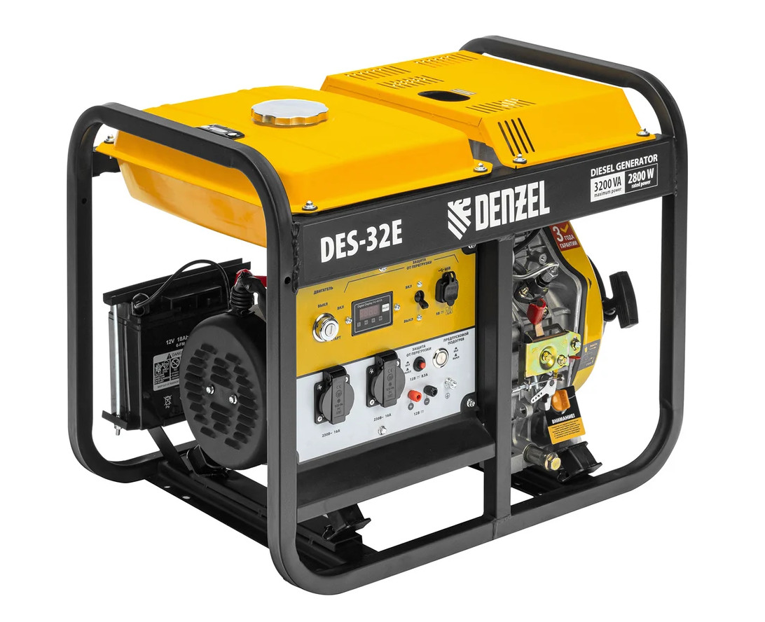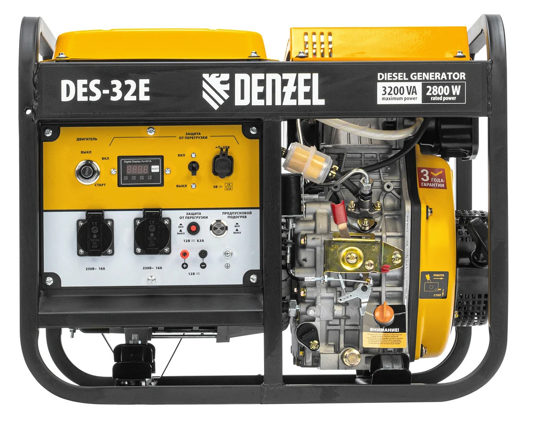 Дизельный генератор имеет максимальную выходную мощность 3,2 кВт и поддерживает напряжение в сети 230 В. Используется для снабжения энергией потребителей однофазного тока (осветительных приборов, бытовой техники, электроинструмента) при отсутствии доступа к стационарному источнику питания. Для подключения электроприборов служат 2 розетки 230 В/16 А. Клеммы постоянного тока 12 В позволяют заряжать автомобильные аккумуляторы, а двойной выход USB 5 В предназначен для подключения мобильных устройств (планшетов, смартфонов и т. д.). Генератор пригодится в загородном доме. Особенности - Функция предпускового подогрева