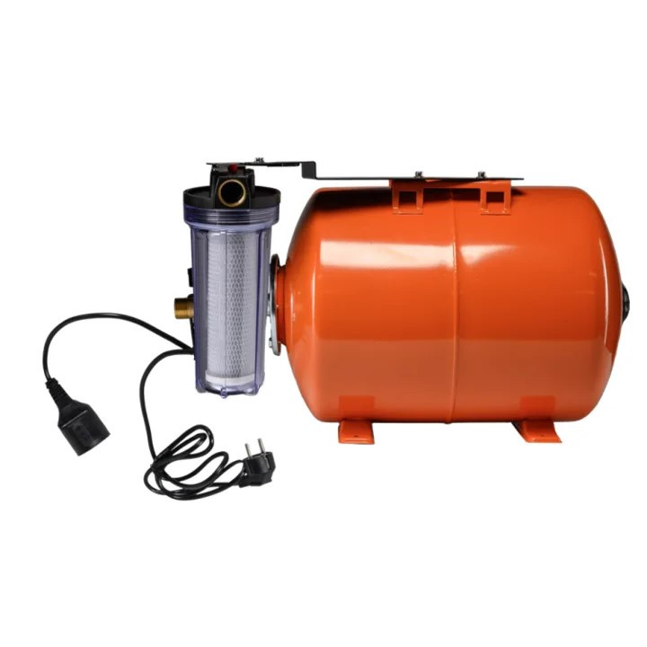Она включает в себя гидробак на 50 литров, фильтр грубой очистки, манометр и реле давления.