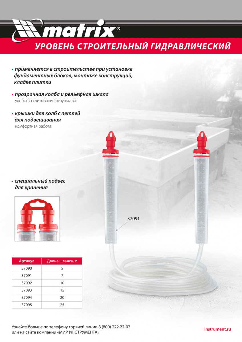 Гидроуровень Matrix 37094 с удлиненными колбами и рельефной градуировкой предназначен для выравнивания объектов на расстоянии до 20 м. Используется при проведении ремонтно-строительных работ: изготовлении опалубки, установке фундамента, кладке плитки. Особо светлые колбы с рельефной градуировкой облегчают считывание результатов измерения.