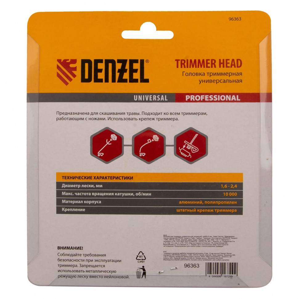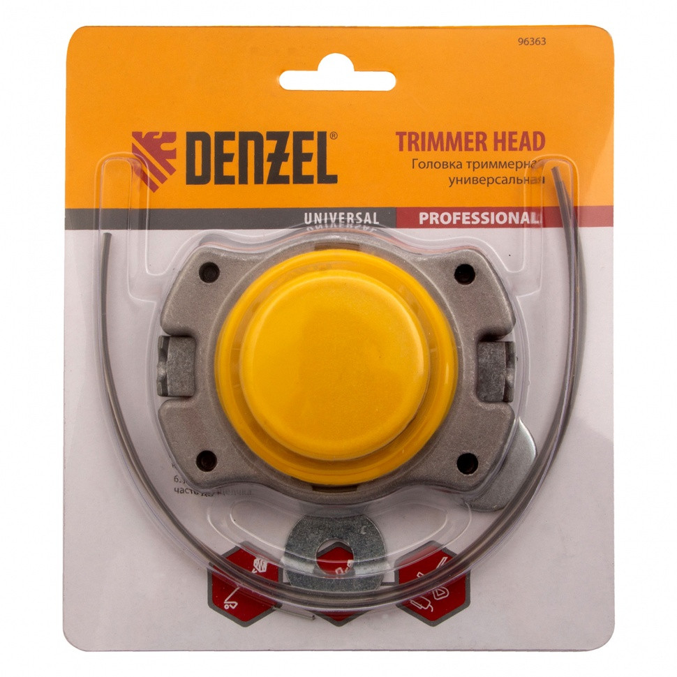 Универсальная триммерная головка Denzel 96363 с корпусом из алюминия и шайбами 8 и 10 мм, совместима с большинством моделей электро- и бензокос. Заправляется режущей леской толщиной до 2,4 мм, что позволяет быстро подравнивать газон и поэтапно срезать траву выше 20 см.