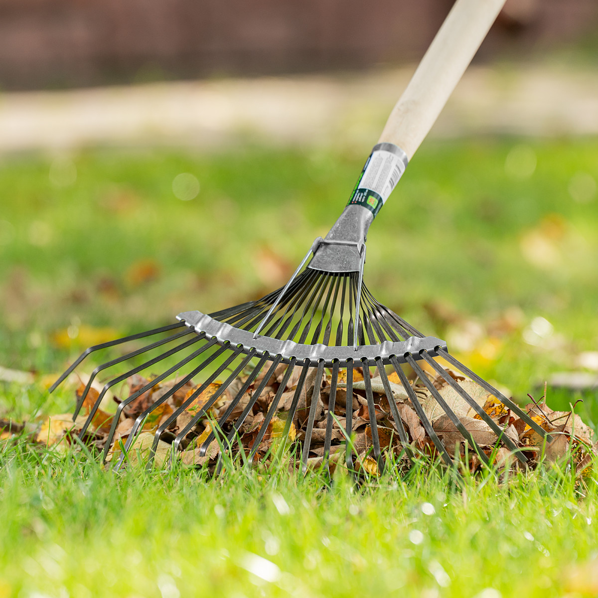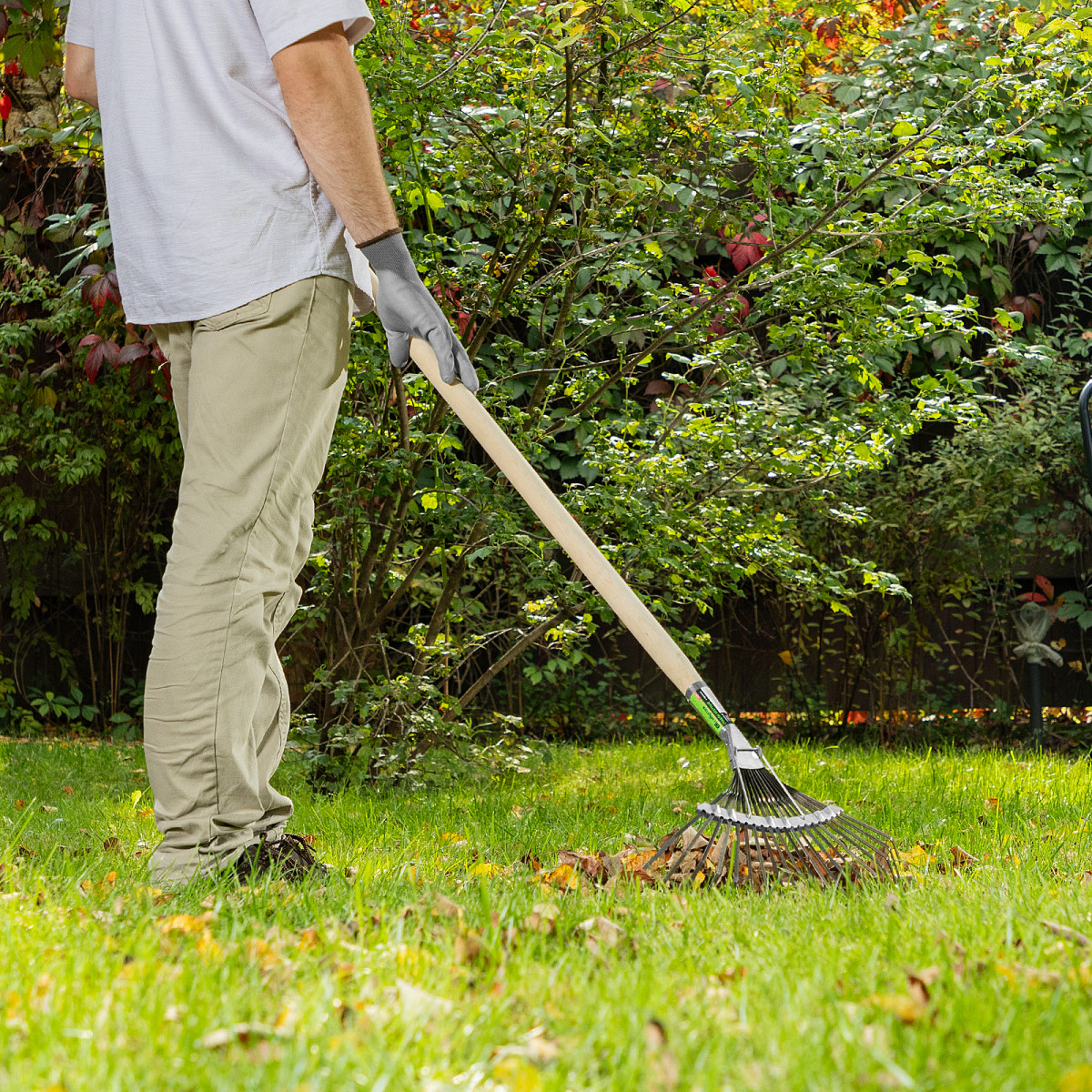 Веерные стальные грабли Сибртех 61779 размером 385 х 1500 мм, с 20 плоскими зубьями и деревянным черенком, предназначены для работы на садовом участке. Позволяют убирать мусор, листву и ветки с лужаек и грядок. Грабли поставляются в сборе с черенком и полностью готовы к эксплуатации.