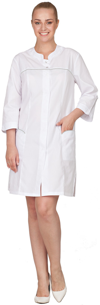 Халат: - полуприлегающий силуэт; - с кокетками; - с декоративным кантом; - центральная потайная застежка на кнопки; - с фигурной обтачкой горловины; - накладные карманы; - рукава втачные, 3/4, с манжетами. Цвет: белый Ткань: 'Тиси' Состав: 65%п/э 35%х/б, пл.120г/м2