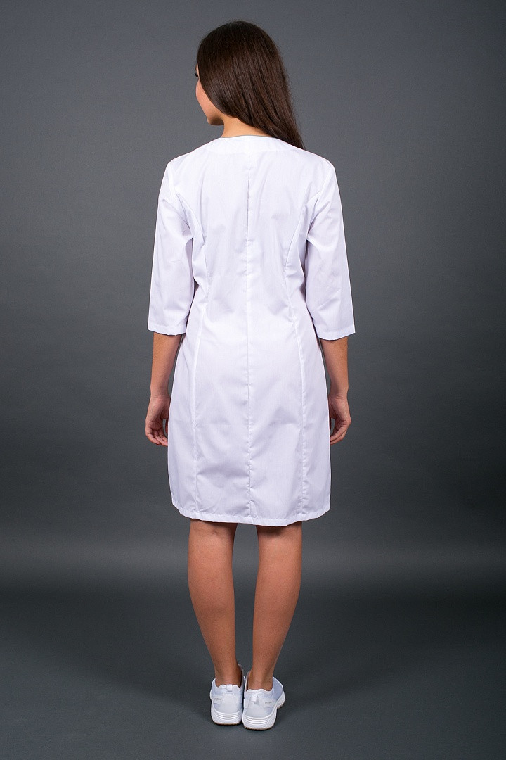 -халат полуприлегающего силуэта -длиной выше колена -с фигурным вырезом горловины -полочка с двумя рельефными швами: из проймы до низа и из горловины до шва первого рельефа -с нагрудными карманами треугольной формы, расположенные между рельефными швами -с внутренними боковыми карманами -спинка со средним швом, с рельефными швами, выходящими из проймы и доходящими до низа -рукав втачной, одношовный 3/4