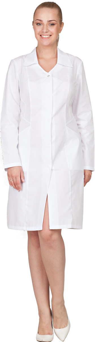 Халат: - полуприлегающий силуэт; - центральная бортовая застежка на кнопки; - рельефы на полочках и спинке; - V-образный вырез горловины с воротником; - воротник стояче-отложной; - карманы в подрезах полочки; - рукава втачные, длинные. Цвет: белый Ткань: 'тиси' Состав: 65%п/э 35%х/б, пл.120г/м2