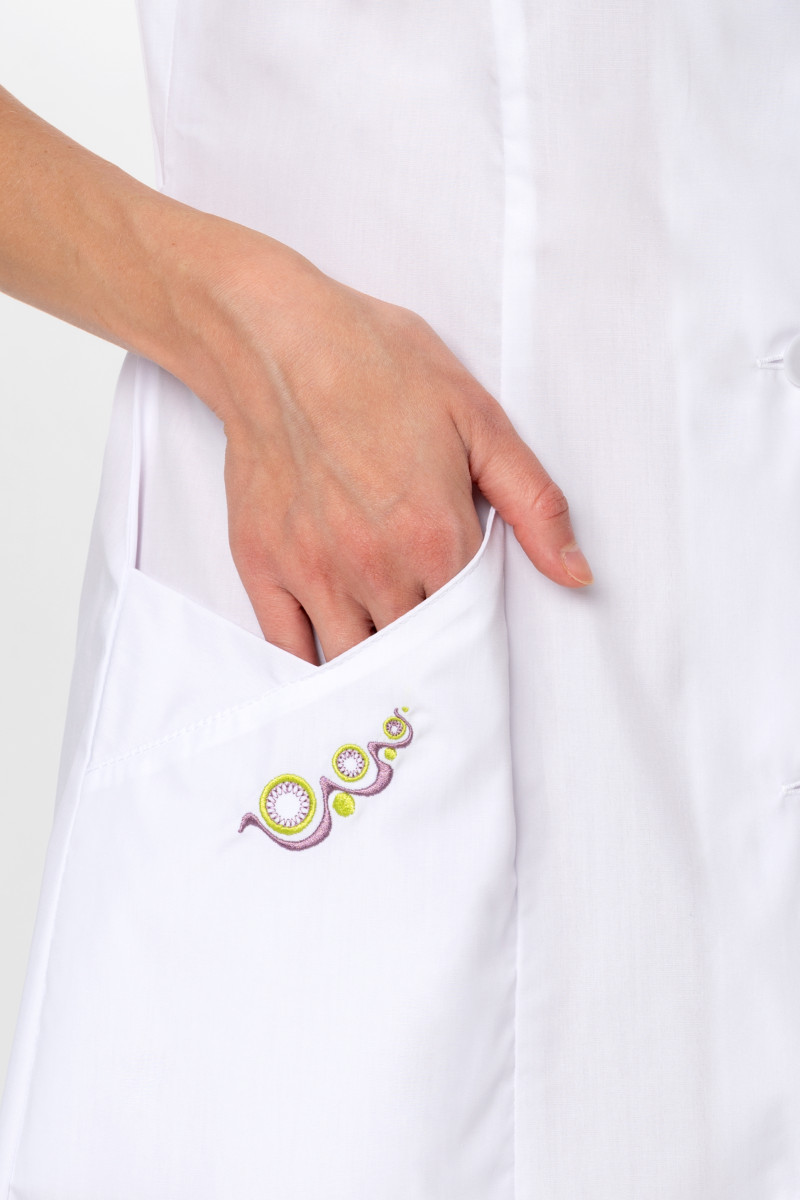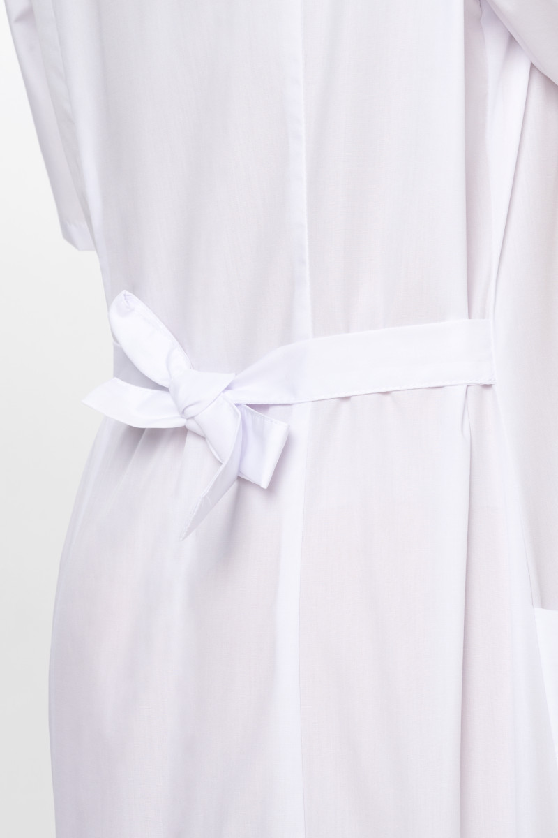Халат: - полуприлегающий силуэт; - центральная застёжка на петли и пуговицы - на кокетке; - рельефные швы на полочке и спинке; - горловина фигурной формы; - рукав короткий; - накладные карманы с вышивкой в шве деталей полочки; - хлястик на спинке. Цвет: белый Ткань: «Тиси» Состав: 65% п/э, 35% х/б, пл. 120 г/м