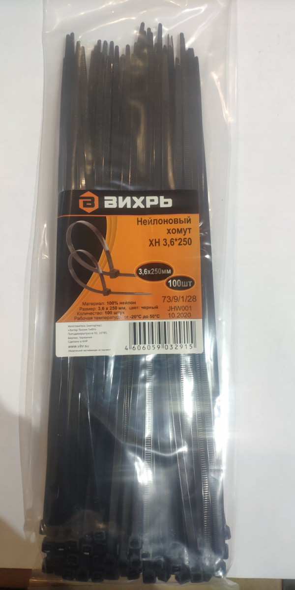 Хомут нейлоновый 3,6*300 черный (100шт) Вихрь