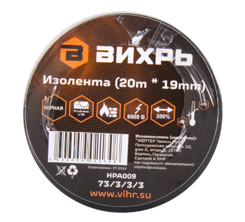 Изолента 19мм*20м черная Вихрь