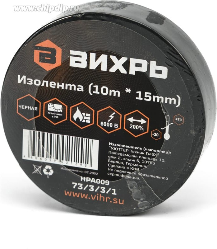 Изолента Изолента ВИХРЬ - это универсальный материал, который находит применение в различных сферах деятельности от ремонта до быта. Она состоит из поливинилхлоридной (ПВХ) основы, на которую нанесен клей. Черная изолента используется для скрытого скрепления и ремонта труб и кабелей. Изоляционная лента обладает высокими клеевыми свойствами и может удлиняться от 170 до 200%. Она выдерживает до 6 кВ и не горит. Диапазон рабочих температур - от -30°С до +70°С.