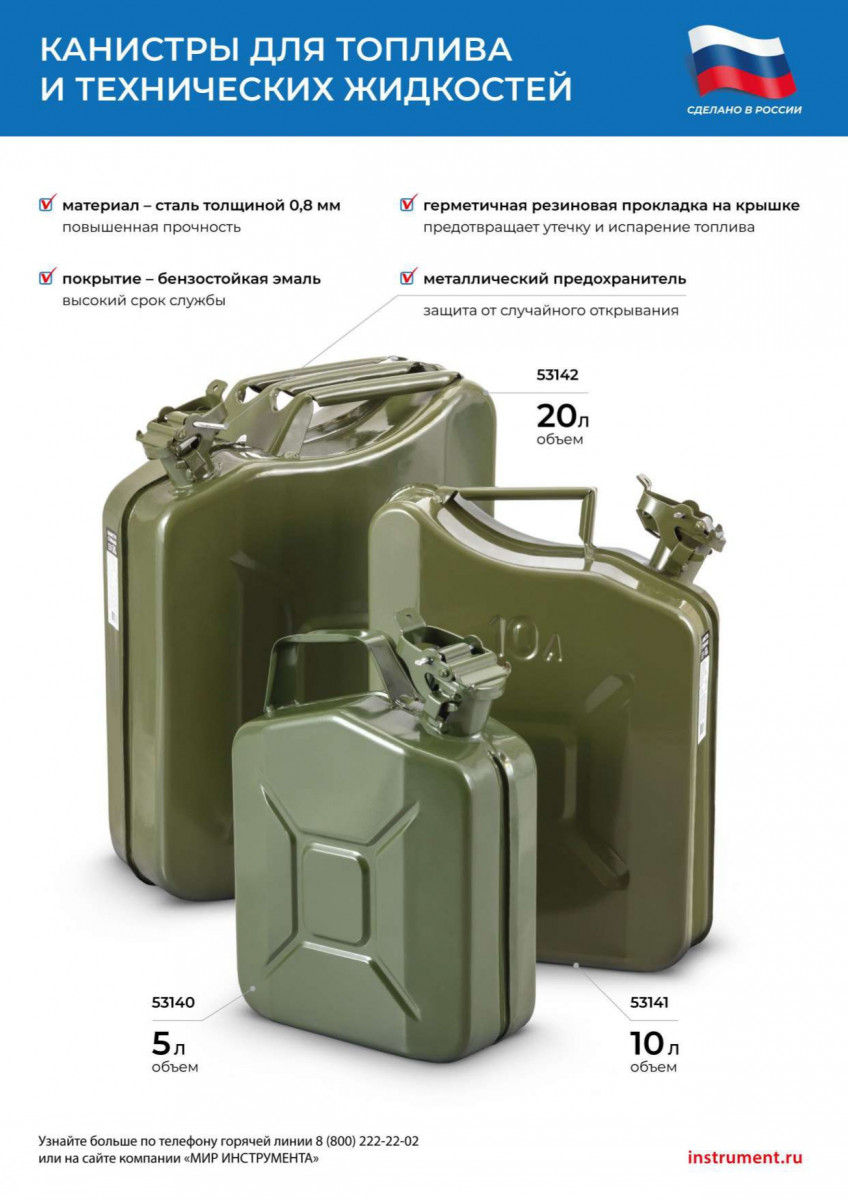 Металлическая канистра 53141 объемом 10 литров, с толщиной стеной 0,8 мм, предназначена для хранения и транспортировки топлива и других горюче-смазочных материалов. Ее удобно брать в дорогу, а также использовать для хранения ГСМ в гараже и на приусадебном участке. Металлическая канистра пригодится для заправки автомобиля в долгом путешествии и для заправки садовой техники.