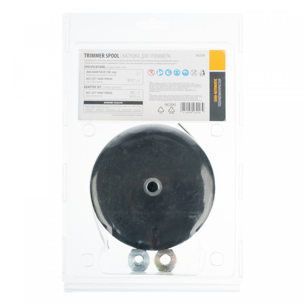 - Универсальность — в комплект поставки входят гайки разных типоразмеров для установки катушки на триммеры с различными типами крепления.