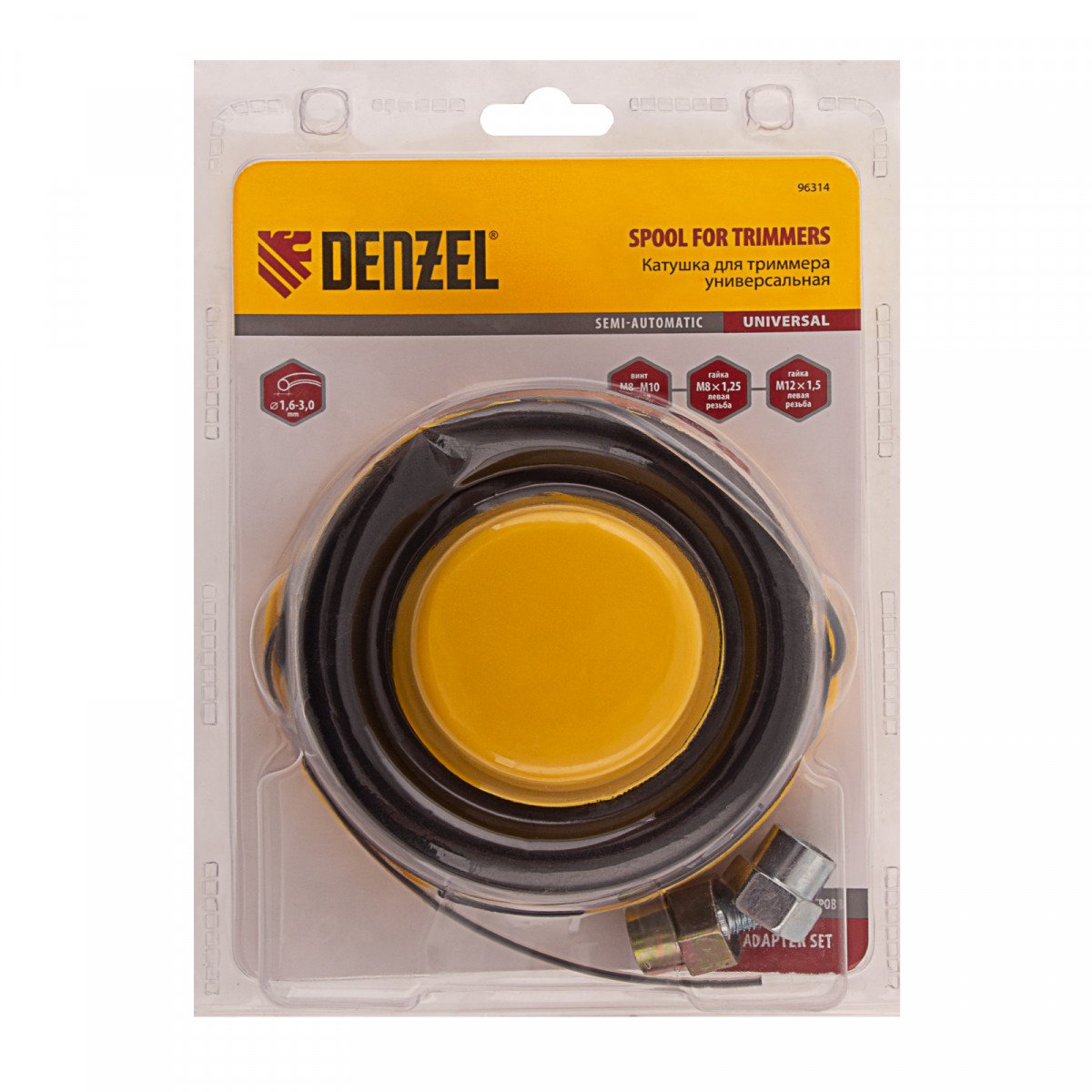 Катушка универсальная триммерная, гайка М10 х 1.25, М8, М12, винт М8-М10, левая резьба, шаг 1.5 мм Denzel