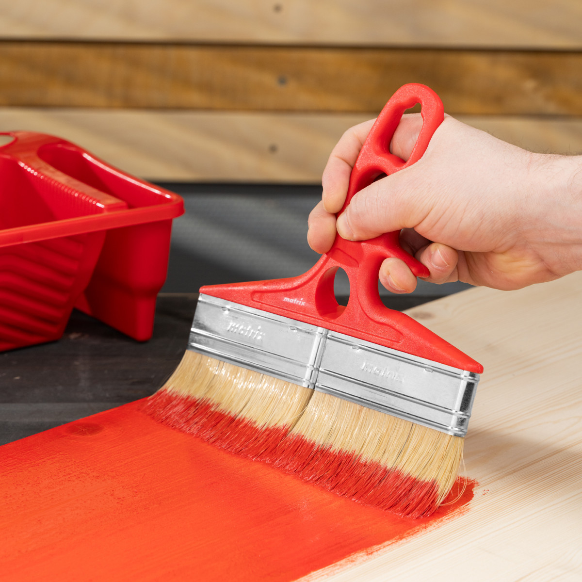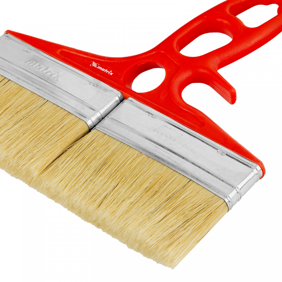 Флейцевая кисть для лаков Color Line Matrix 83369 шириной 200 мм и толщиной 12 мм, с натуральной щетиной и пластиковой ручкой, используется при отделке поверхностей лаковыми составами. Увеличенные размеры быстро обрабатывать участки большой площади. Натуральная светлая щетина расщеплена на концах, поэтому хорошо поглощает и отдает ЛКМ.