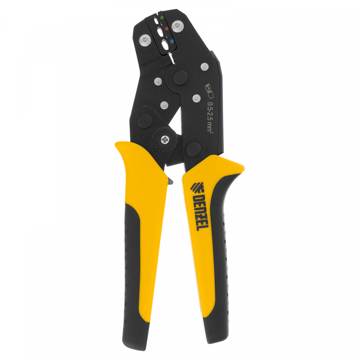 Клещи Denzel 17747 предназначены для обжима изолированных кольцевых наконечников НКИ и вилочных НВИ, разъемов плоских РПИ, гильз соединительных ГСИ, 0,5 - 2,5 мм². Двухкомпонентные рукоятки эргономичной формы обеспечивают удобство в работе. Трещоточный механизм позволяет производить соединение до полного обжима.