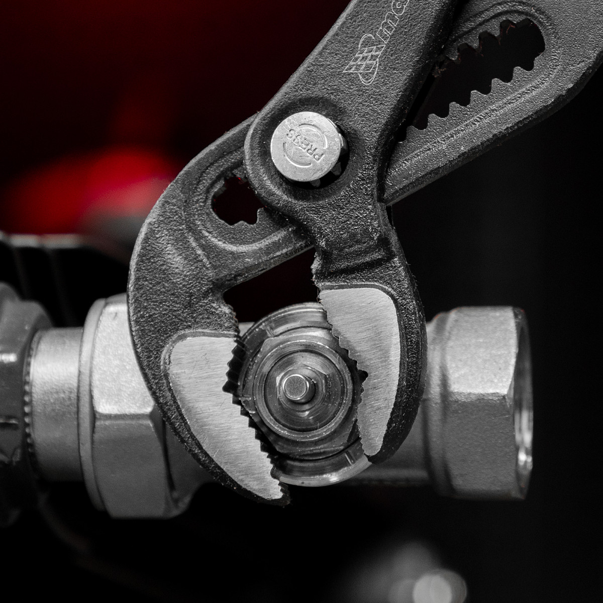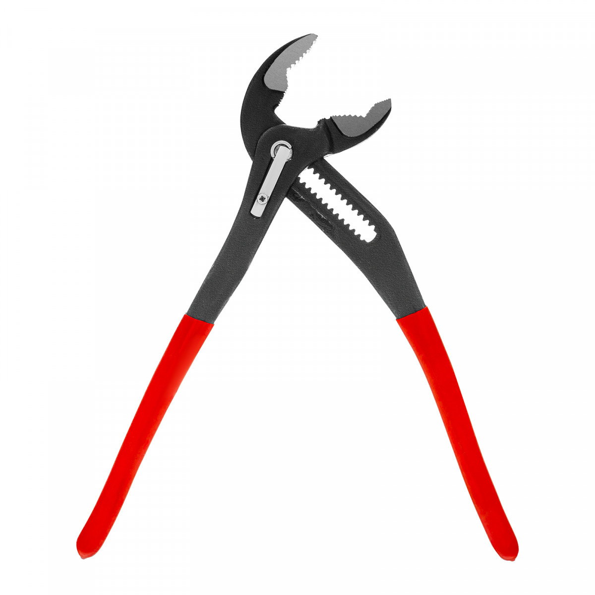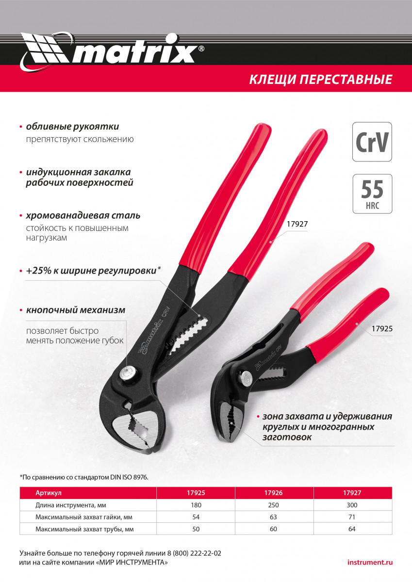Переставные клещи Matrix 17927 длиной 300 мм, выполненные из хромованадиевой стали, с кнопочным механизмом и обливными рукоятками, используются для проведения монтажных и слесарных работ. Универсальный инструмент заменяет ключи различных размеров и применяется для фиксации заготовок, откручивания гаек, зажима и удержания труб диаметром до 64 мм.